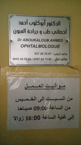Le cabinet d'Ophtalmologie du docteur ABOU KALOUB, localisé à GUELMA, dans la wilaya de GUELMA vous accueille de 08:00h à 16:00h, vous trouverez ci-dessous tous les actes pratiqués et les pathologies traitées par cet établissement.