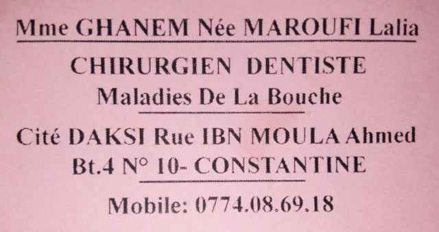 Le cabinet de Chirurgie dentaire du docteur SOFIANE BOUSSALIA, localisé à CONSTANTINE, dans la wilaya de CONSTANTINE vous accueille de 08:00h à 16:00h, vous trouverez ci-dessous tous les actes pratiqués et les pathologies traitées par cet établissement.
