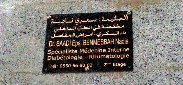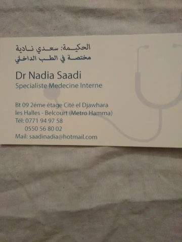 Le cabinet de Médecine Interne du docteur NADIA SAADI, localisé à ALGER CENTRE, dans la wilaya d'ALGER vous accueille de 08:00h à 16:00h, vous trouverez ci-dessous tous les actes pratiqués et les pathologies traitées par cet établissement.