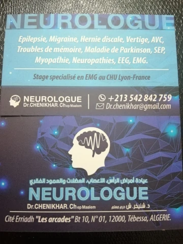 Le cabinet de Neurologie du docteur CHENIKHAR, localisé à TEBESSA, dans la wilaya de TEBESSA vous accueille de 08:00h à 16:30h, vous trouverez ci-dessous tous les actes pratiqués et les pathologies traitées par cet établissement.