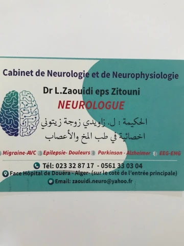 Le cabinet de Neurologie du docteur LATIFA ZAOUIDI ZITOUNI, localisé à DOUERA, dans la wilaya d'ALGER vous accueille de 08:30h à 15:00h, vous trouverez ci-dessous tous les actes pratiqués et les pathologies traitées par cet établissement.