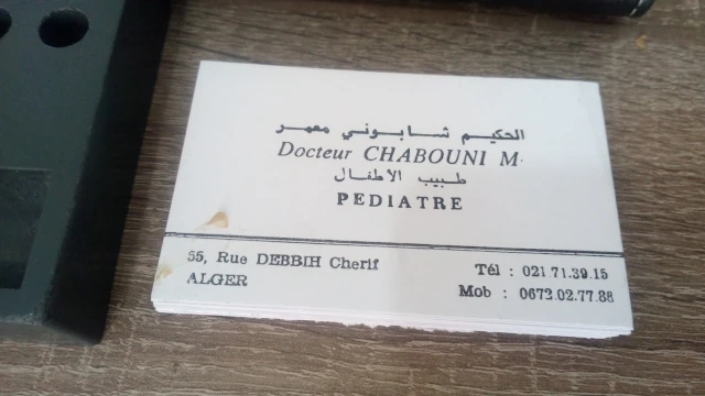 Le cabinet de Pédiatrie du docteur MAAMAR CHABOUNI, localisé à ALGER CENTRE, dans la wilaya d'ALGER vous accueille de 09:00h à 16:00h, vous trouverez ci-dessous tous les actes pratiqués et les pathologies traitées par cet établissement.