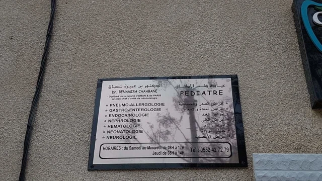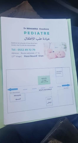 Le cabinet de Pédiatrie du docteur CHABANE BEN AMIR, localisé à HASSI BOUNIF, dans la wilaya d'ORAN vous accueille de 09:00h à 17:00h, vous trouverez ci-dessous tous les actes pratiqués et les pathologies traitées par cet établissement.