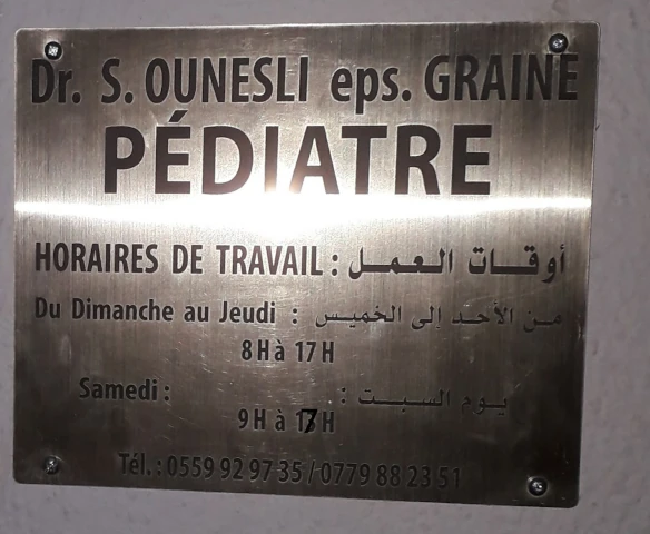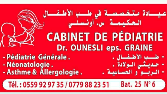 Le cabinet de Pédiatrie du docteur S OUNESLI, localisé à BAB EZZOUAR, dans la wilaya d'ALGER vous accueille de 08:00h à 17:00h, vous trouverez ci-dessous tous les actes pratiqués et les pathologies traitées par cet établissement.