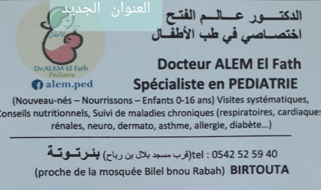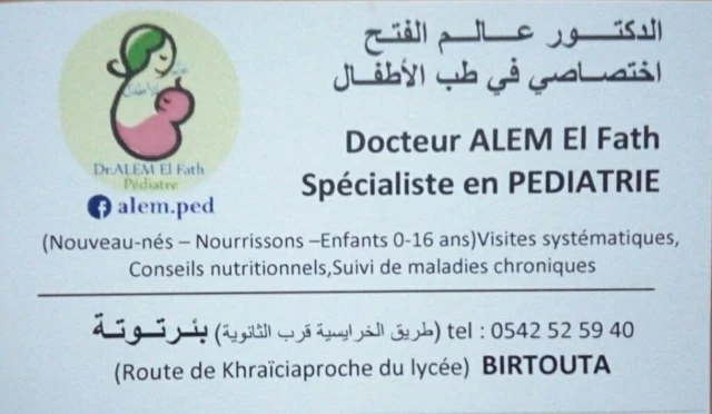 Le cabinet de Pédiatrie du docteur ALEM, localisé à BIRTOUTA, dans la wilaya d'ALGER vous accueille de 09:00h à 18:00h, vous trouverez ci-dessous tous les actes pratiqués et les pathologies traitées par cet établissement.