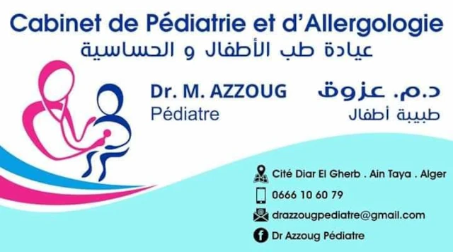 Le cabinet de Pédiatrie du docteur MOUNIRA AZZOUG LAIDI, localisé à AIN TAYA, dans la wilaya d'ALGER vous accueille de 09:00h à 17:00h, vous trouverez ci-dessous tous les actes pratiqués et les pathologies traitées par cet établissement.