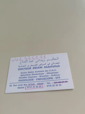 Le cabinet de Pneumologie allergologie du docteur ABDELFATTEH ZIDANI, localisé à ORAN, dans la wilaya d'ORAN vous accueille de 08:00h à 16:00h, vous trouverez ci-dessous tous les actes pratiqués et les pathologies traitées par cet établissement.