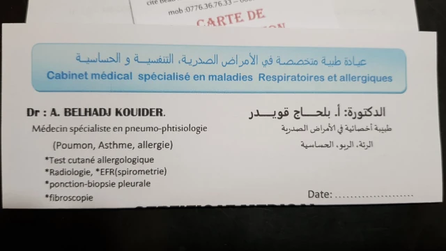 Le cabinet de Pneumologie Phtisiologie du docteur AMINA BELHADJ KOUIDER, localisé à MILIANA, dans la wilaya d'AIN DEFLA vous accueille de 09:00h à 16:00h, vous trouverez ci-dessous tous les actes pratiqués et les pathologies traitées par cet établissement.
