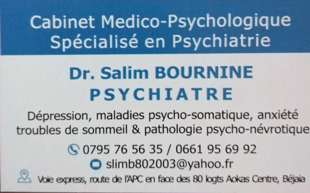 Le cabinet de psychiatrie du docteur BOURNINE, localisé à AOKAS, dans la wilaya de BEJAIA vous accueille de 08:00h à 16:00h, vous trouverez ci-dessous tous les actes pratiqués et les pathologies traitées par cet établissement.