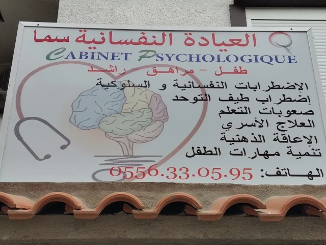 Le cabinet de psychologie SAMA, localisé à OUED SMAR, dans la wilaya d'ALGER vous accueille de 09:00h à 17:00h, vous trouverez ci-dessous tous les actes pratiqués et les pathologies traitées par cet établissement.