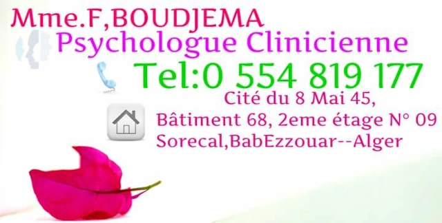 Le cabinet de psychologie F BOUDJEMA MOUBAREK, localisé à BORDJ EL KIFFAN, dans la wilaya d'ALGER vous accueille de 09:30h à 17:00h, vous trouverez ci-dessous tous les actes pratiqués et les pathologies traitées par cet établissement.