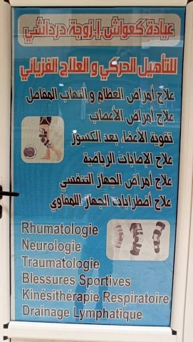 Le Cabinet de Rééducation et réadaptation fonctionnelles du docteur KAOUACHE, localisé à KAOUS, dans la wilaya de JIJEL vous accueille de 08:00h à 16:00h, vous trouverez ci-dessous tous les actes pratiqués et les pathologies traitées par cet établissement.