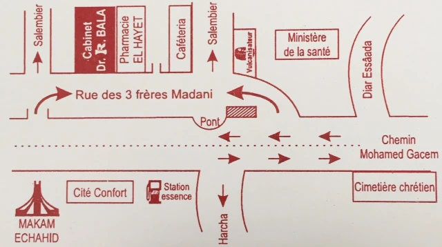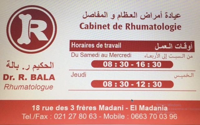 Le cabinet de Rhumatologie du docteur R BALA, localisé à EL MADANIA, dans la wilaya d'ALGER vous accueille de 08:30h à 20:30h, vous trouverez ci-dessous tous les actes pratiqués et les pathologies traitées par cet établissement.