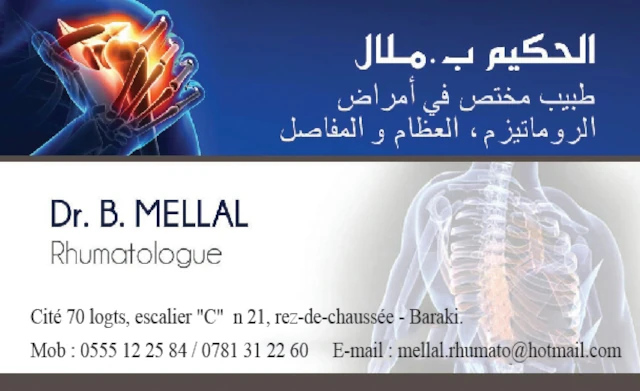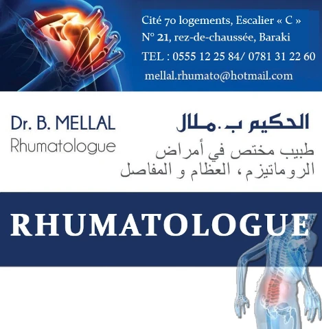 Le cabinet de Rhumatologie du docteur BRAHIM MELLAL, localisé à BARAKI, dans la wilaya d'ALGER vous accueille de 09:00h à 16:00h, vous trouverez ci-dessous tous les actes pratiqués et les pathologies traitées par cet établissement.