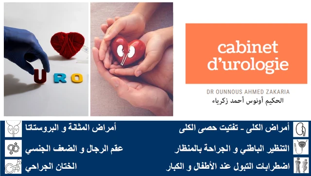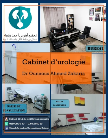 Le cabinet d'Urologie du docteur AHMED ZAKARIA OUNNOUS, localisé à EL KHROUB, dans la wilaya de CONSTANTINE vous accueille de 08:00h à 16:00h, vous trouverez ci-dessous tous les actes pratiqués et les pathologies traitées par cet établissement.