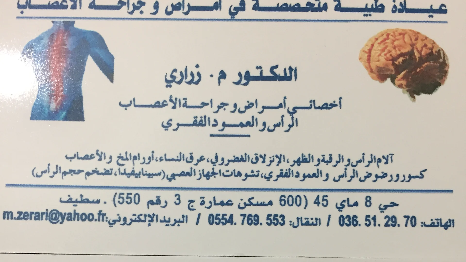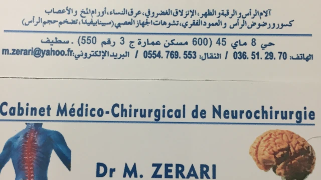 Le cabinet de Neurochirurgue du docteur MEFTAH zerari, localisé à SETIF, dans la wilaya de Setif vous accueille de 08:30h à 14:00h, vous trouverez ci-dessous tous les actes pratiqués et les pathologies traitées par cet établissement.