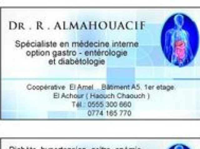 Le cabinet de Médecine Interne du docteur RADIA ALMAHOUACIF, localisé à EL ACHOUR, dans la wilaya d'ALGER vous accueille de 09:00h à 16:30h, vous trouverez ci-dessous tous les actes pratiqués et les pathologies traitées par cet établissement.