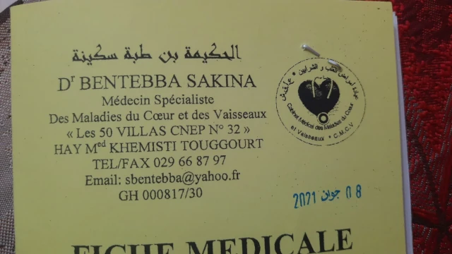 Le cabinet de Cardiologie du docteur SAKINA BEN TEBBA, localisé à TOUGGOURT, dans la wilaya de TOUGGOURT vous accueille de 07:00h à 13:00h, vous trouverez ci-dessous tous les actes pratiqués et les pathologies traitées par cet établissement.