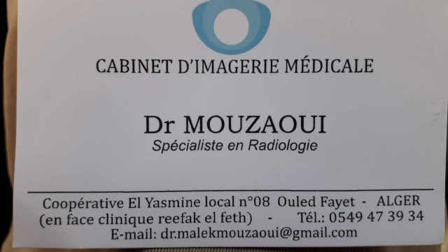Le Centre de radiologie et d'imagerie médicale du docteur MOUZAOUI, localisé à OULED FAYET, dans la wilaya d'ALGER vous accueille de 08:30h à 16:30h, vous trouverez ci-dessous tous les actes pratiqués et les pathologies traitées par cet établissement.