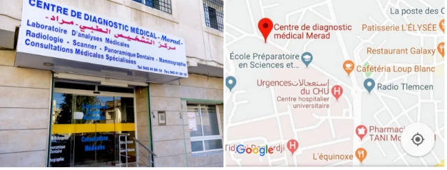 Le Centre d'imagerie pour diagnostic Médical TLEMCEN du docteur MERAD, localisé à TLEMCEN, dans la wilaya de TLEMCEN vous accueille de 07:30h à 20:00h, vous trouverez ci-dessous tous les actes pratiqués et les pathologies traitées par cet établissement.