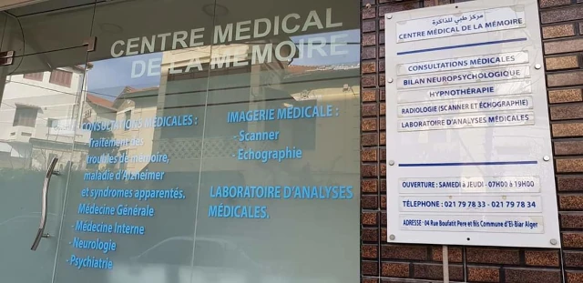 Le Centre d'imagerie pour diagnostic Médical DE LA MÉMOIRE, localisé à EL BIAR, dans la wilaya d'ALGER vous accueille de 07:00h à 19:00h, vous trouverez ci-dessous tous les actes pratiqués et les pathologies traitées par cet établissement.