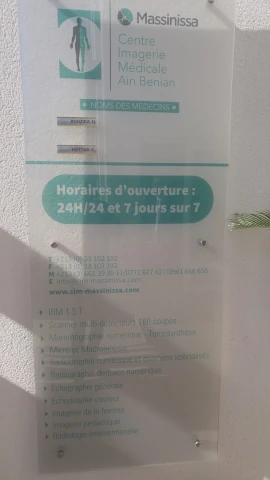 Le Centre d'imagerie pour diagnostic Médical MASSINISSA, localisé à AIN BENIAN, dans la wilaya d'ALGER vous accueille de 08:00h à 17:00h, vous trouverez ci-dessous tous les actes pratiqués et les pathologies traitées par cet établissement.