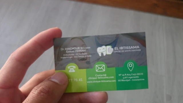 Le cabinet de Chirurgie dentaire EL IBTISSAMA, localisé à EL KHROUB, dans la wilaya de CONSTANTINE vous accueille de 08:00h à 20:00h, vous trouverez ci-dessous tous les actes pratiqués et les pathologies traitées par cet établissement.