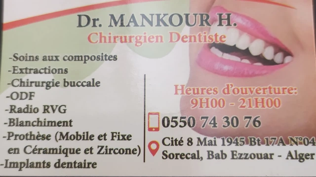 Le cabinet de Chirurgie dentaire du docteur MANKOUR, localisé à BAB EZZOUAR, dans la wilaya d'ALGER vous accueille de 09:00h à 21:00h, vous trouverez ci-dessous tous les actes pratiqués et les pathologies traitées par cet établissement.