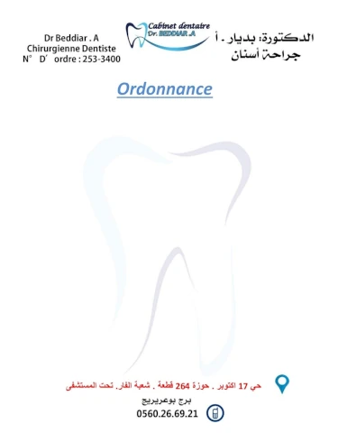 Le cabinet de Chirurgie dentaire du docteur BEDIAR, localisé à BORDJ BOU ARRERIDJ, dans la wilaya de BORDJ BOU ARRERIDJ vous accueille de 08:00h à 16:00h, vous trouverez ci-dessous tous les actes pratiqués et les pathologies traitées par cet établissement.