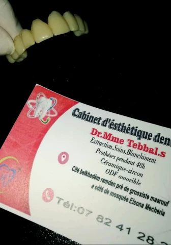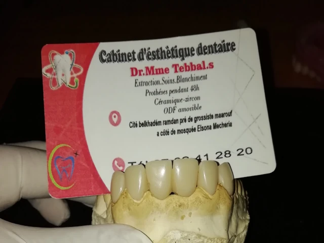 Le cabinet de Chirurgie dentaire du docteur TEBBAL, localisé à MECHERIA, dans la wilaya de NAAMA vous accueille de 09:00h à 16:30h, vous trouverez ci-dessous tous les actes pratiqués et les pathologies traitées par cet établissement.