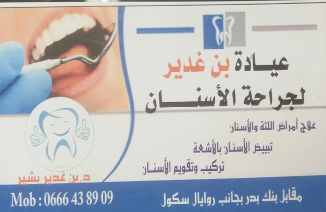 Le cabinet de Chirurgie dentaire du docteur BEN GHEDIER, localisé à OUARGLA, dans la wilaya d'OUARGLA vous accueille de 08:00h à 18:00h, vous trouverez ci-dessous tous les actes pratiqués et les pathologies traitées par cet établissement.