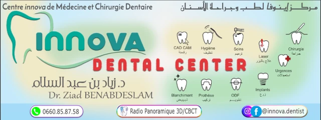 Le cabinet de Chirurgie dentaire INNOVA du docteur ZIAD BEN ABDESSELAM, localisé à SOUK AHRAS, dans la wilaya de SOUK AHRAS vous accueille de 08:30h à 16:30h, vous trouverez ci-dessous tous les actes pratiqués et les pathologies traitées par cet établissement.