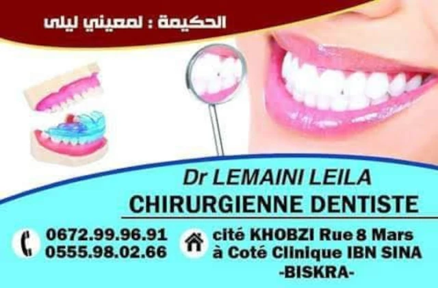 Le cabinet de Chirurgie dentaire EL RIHAB du docteur LEILA LEMAINI, localisé à BISKRA, dans la wilaya de BISKRA vous accueille de 08:00h à 17:00h, vous trouverez ci-dessous tous les actes pratiqués et les pathologies traitées par cet établissement.