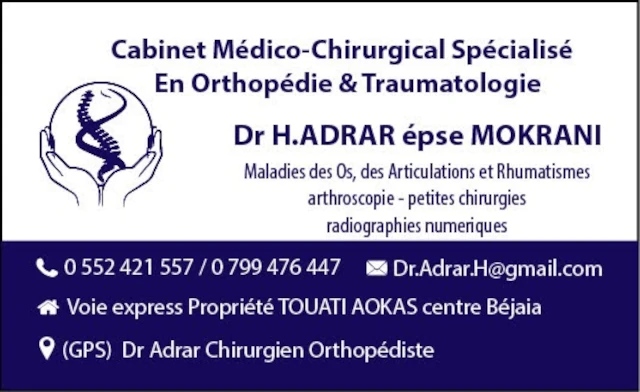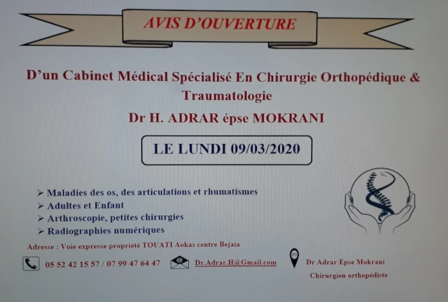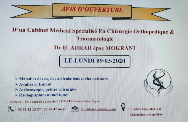 Le cabinet de Chirurgie dentaire du docteur SALAH ADRAR, localisé à AOKAS, dans la wilaya de BEJAIA vous accueille de 08:00h à 16:00h, vous trouverez ci-dessous tous les actes pratiqués et les pathologies traitées par cet établissement.