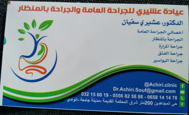 Le cabinet de Chirurgie Générale du docteur ACHIRI, localisé à DJAMAA, dans la wilaya d'EL MEGHAIER vous accueille de 08:00h à 16:00h, vous trouverez ci-dessous tous les actes pratiqués et les pathologies traitées par cet établissement.