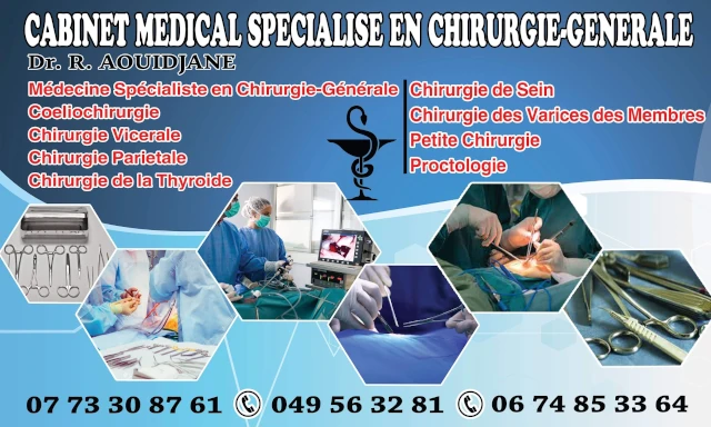 Le cabinet de Chirurgie Générale du docteur RAMEZ AOUIDJANE, localisé à AIN SEFRA, dans la wilaya de NAAMA vous accueille de 08:30h à 17:00h, vous trouverez ci-dessous tous les actes pratiqués et les pathologies traitées par cet établissement.