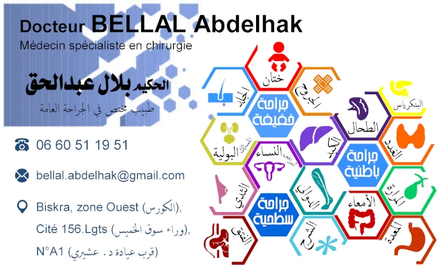 Le cabinet de Chirurgie Générale du docteur ABDELHAK BELLAL, localisé à BISKRA, dans la wilaya de BISKRA vous accueille de 08:00h à 14:00h, vous trouverez ci-dessous tous les actes pratiqués et les pathologies traitées par cet établissement.