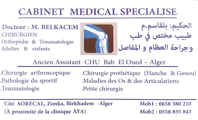 Le cabinet de chirurgie orthopédique et traumatologique du docteur BELKACEM, localisé à BIRKHADEM, dans la wilaya d'ALGER vous accueille de 08:00h à 16:00h, vous trouverez ci-dessous tous les actes pratiqués et les pathologies traitées par cet établissement.