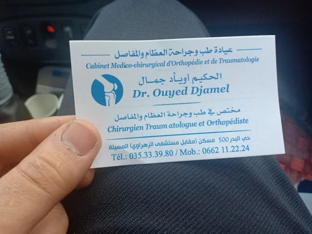 Le cabinet de chirurgie orthopédique et traumatologique du docteur DJAMEL OUYED, localisé à MSILA, dans la wilaya de MSILA vous accueille de 08:00h à 16:00h, vous trouverez ci-dessous tous les actes pratiqués et les pathologies traitées par cet établissement.