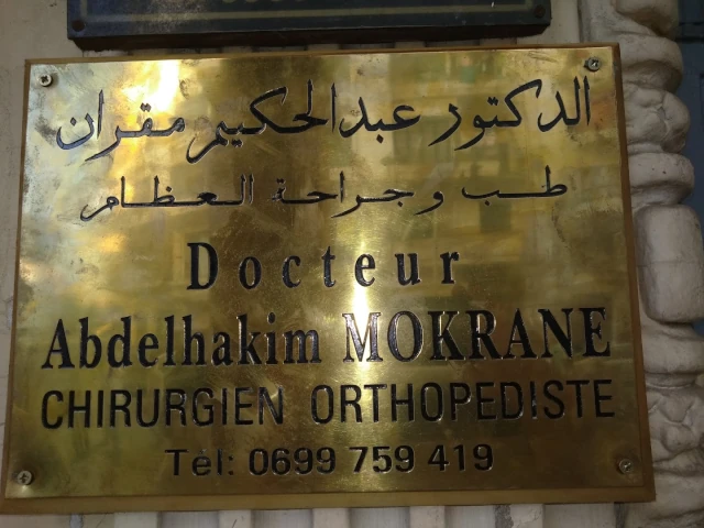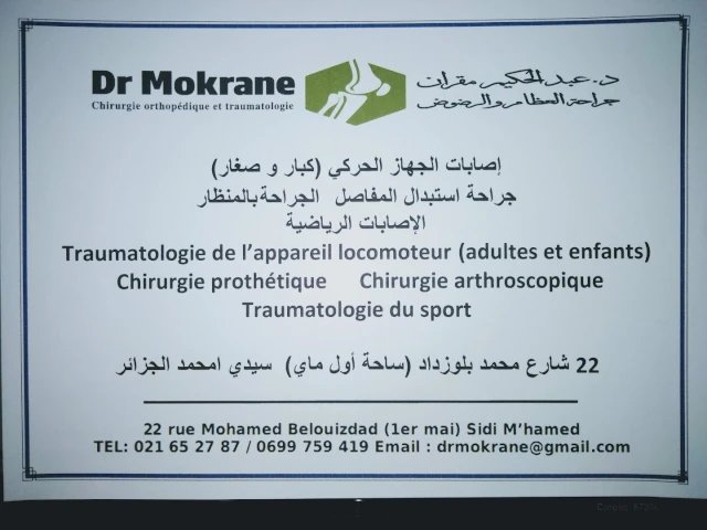 Le cabinet de chirurgie orthopédique et traumatologique du docteur ABDELHAKIM MOKRANE, localisé à SIDI MHAMED, dans la wilaya d'ALGER vous accueille de 08:30h à 17:00h, vous trouverez ci-dessous tous les actes pratiqués et les pathologies traitées par cet établissement.