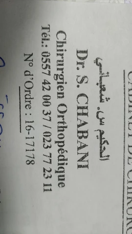 Le cabinet de chirurgie orthopédique et traumatologique du docteur SALIM CHABANI, localisé à HUSSEIN DEY, dans la wilaya d'ALGER vous accueille de 09:00h à 17:00h, vous trouverez ci-dessous tous les actes pratiqués et les pathologies traitées par cet établissement.