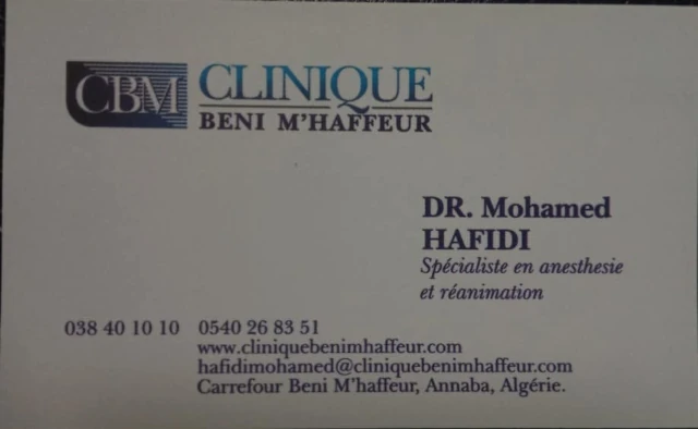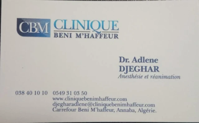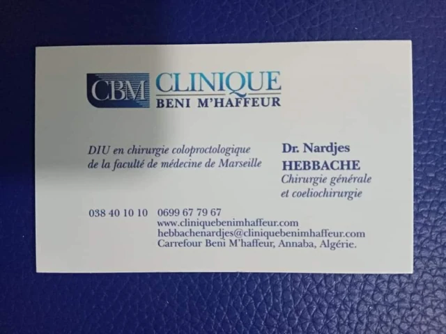 La Clinique médico-chirurgicale BENI M'HAFFEUR, localisée à ANNABA, dans la wilaya d'ANNABA vous accueille de 08:00h à 16:00h, vous trouverez ci-dessous tous les actes pratiqués et les pathologies traitées par cet établissement.