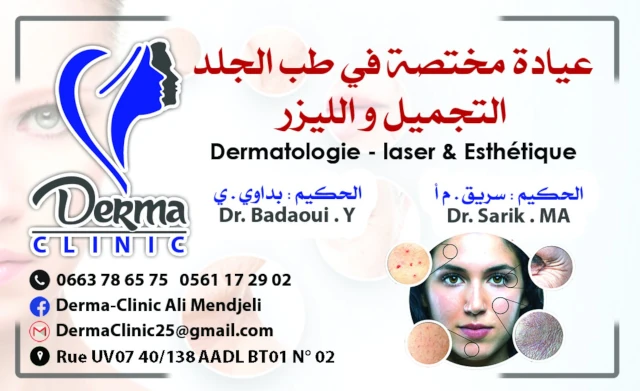 Le cabinet de Dermatologie BADAOUI SARIK, localisé à EL KHROUB, dans la wilaya de CONSTANTINE vous accueille de 08:00h à 16:00h, vous trouverez ci-dessous tous les actes pratiqués et les pathologies traitées par cet établissement.