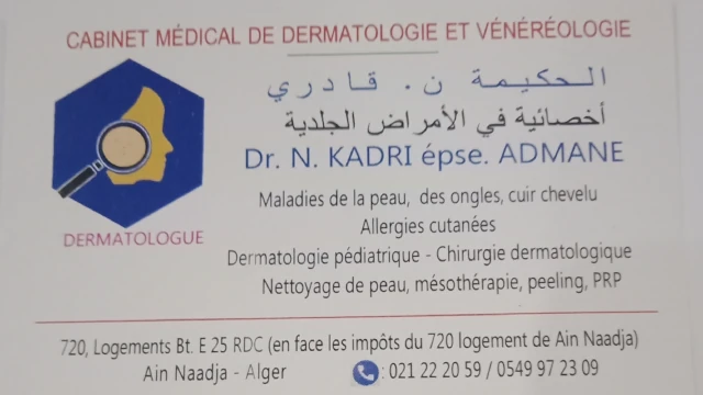 Le cabinet de Dermatologie du docteur N KADRI ADMANE, localisé à AIN NAADJA, dans la wilaya d'ALGER vous accueille de 08:30h à 16:30h, vous trouverez ci-dessous tous les actes pratiqués et les pathologies traitées par cet établissement.