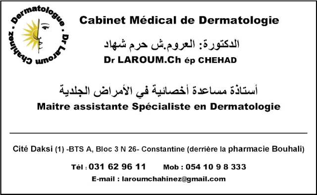 Le cabinet de Dermatologie du docteur CHAHINEZ LAROUM CHEHAD, localisé à CONSTANTINE, dans la wilaya de CONSTANTINE vous accueille de 09:00h à 16:00h, vous trouverez ci-dessous tous les actes pratiqués et les pathologies traitées par cet établissement.
