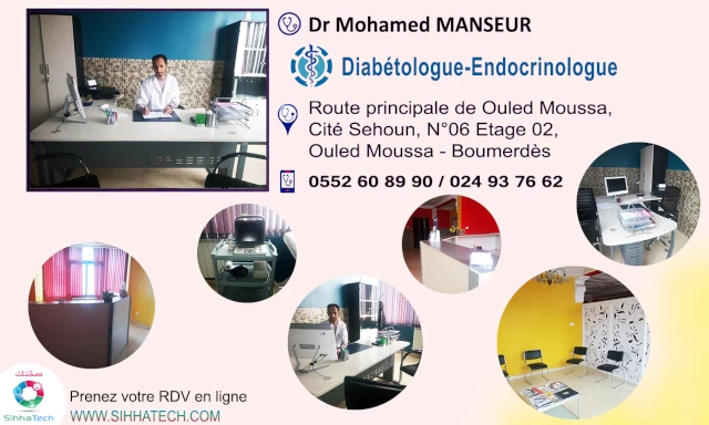 Le cabinet d'Endocrinologie du docteur MOHAMED MANSEUR, localisé à OULED MOUSSA, dans la wilaya de BOUMERDES vous accueille de 08:30h à 16:00h, vous trouverez ci-dessous tous les actes pratiqués et les pathologies traitées par cet établissement.