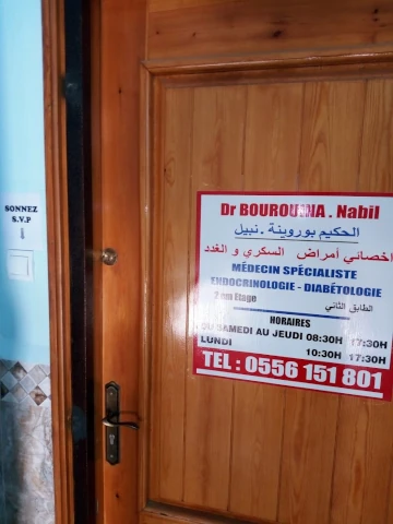 Le cabinet d'Endocrinologie du docteur NABIL BOUROUINA, localisé à BORDJ EL BAHRI, dans la wilaya d'ALGER vous accueille de 08:30h à 16:30h, vous trouverez ci-dessous tous les actes pratiqués et les pathologies traitées par cet établissement.