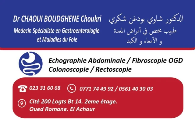 Le cabinet de Gastro entérologie et hépatologie du docteur CHOUKRI CHAOUI BOUDGHÈNE, localisé à EL ACHOUR, dans la wilaya d'ALGER vous accueille de 09:00h à 16:00h, vous trouverez ci-dessous tous les actes pratiqués et les pathologies traitées par cet établissement.