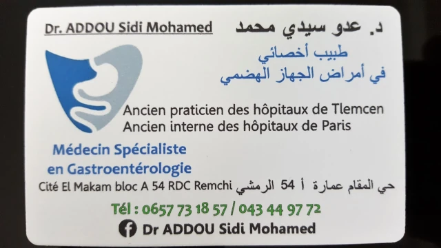 Le cabinet de Gastro entérologie et hépatologie du docteur ADDOU, localisé à REMCHI, dans la wilaya de TLEMCEN vous accueille de 08:00h à 16:00h, vous trouverez ci-dessous tous les actes pratiqués et les pathologies traitées par cet établissement.