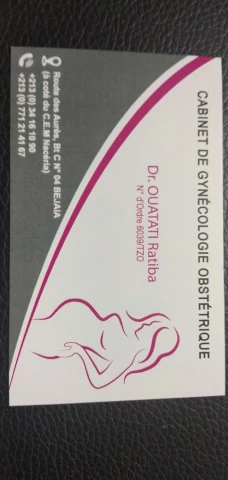 Le cabinet de Gynécologie obstétrique du docteur RATIBA OUATATI, localisé à BEJAIA, dans la wilaya de BEJAIA vous accueille de 09:00h à 16:00h, vous trouverez ci-dessous tous les actes pratiqués et les pathologies traitées par cet établissement.
